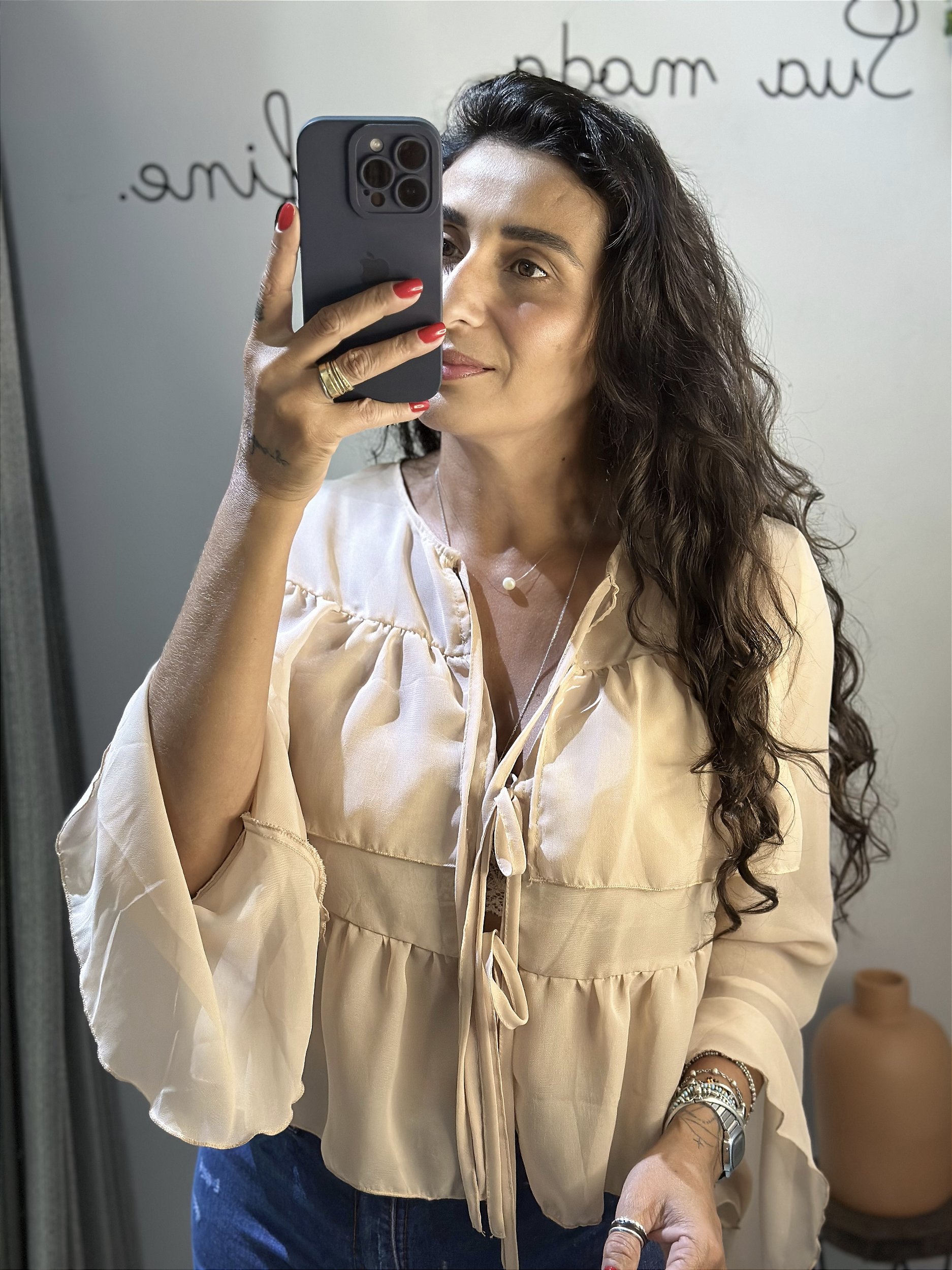 Bata manga longa em chiffon transparente com laços.