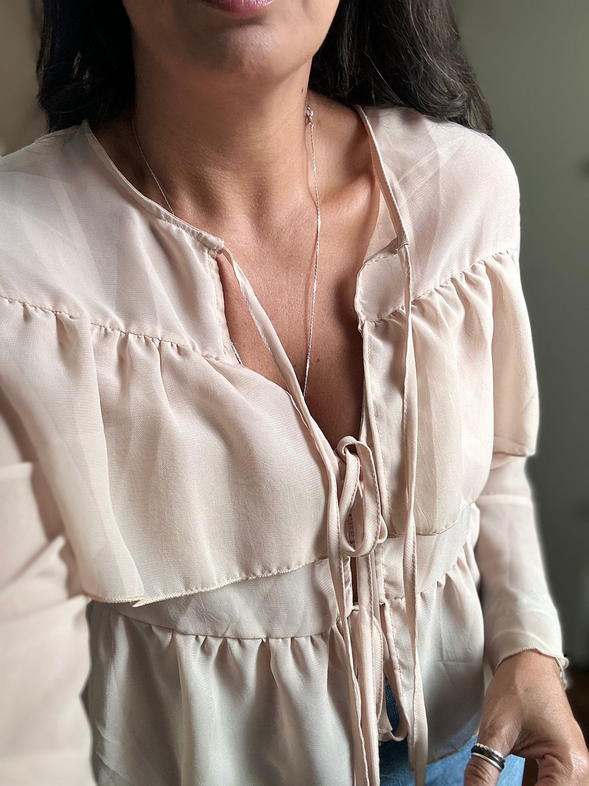 Bata babados em organza, com detalhes de babados e amarração frontal.