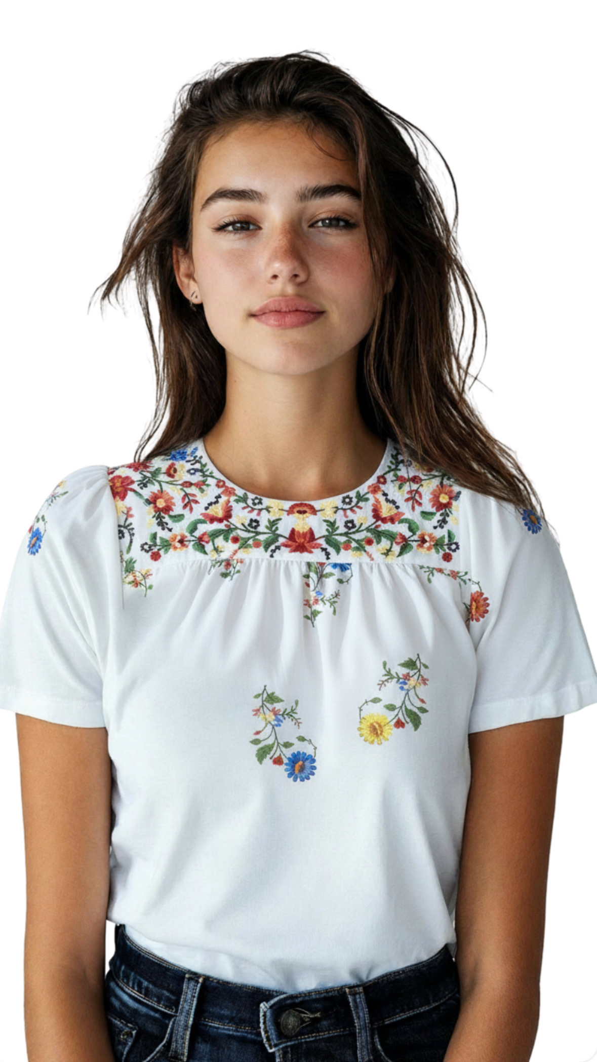 Camisa com gola bordada e silk da estampa bordada somente na frente.