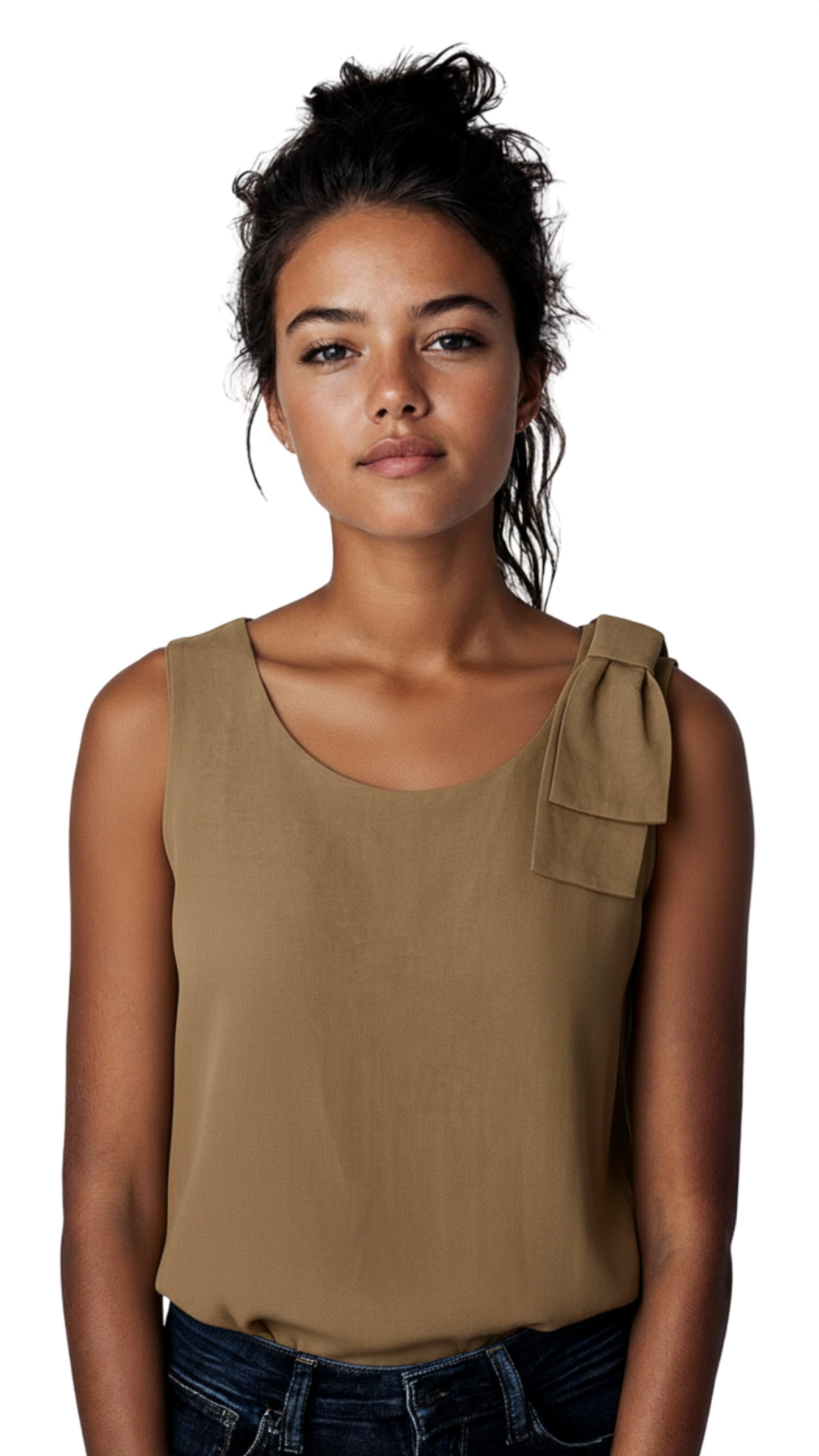 Regata em viscolinho,alça larga com detalhe em laço lateral no ombro.