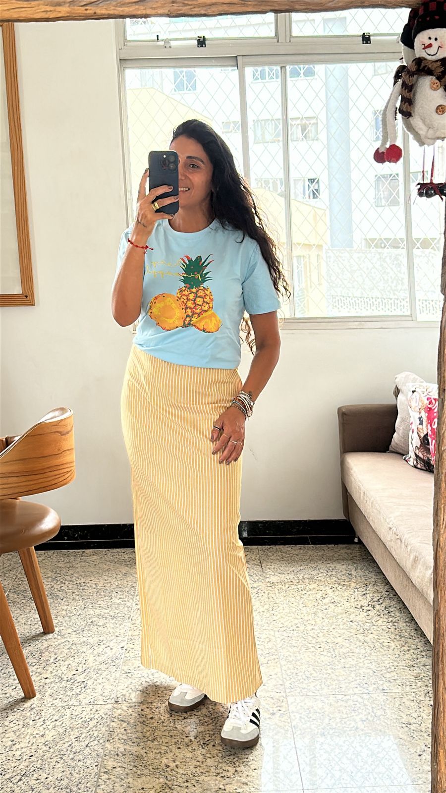 Saia slim, com fenda nas costas, cos em risca de giz.