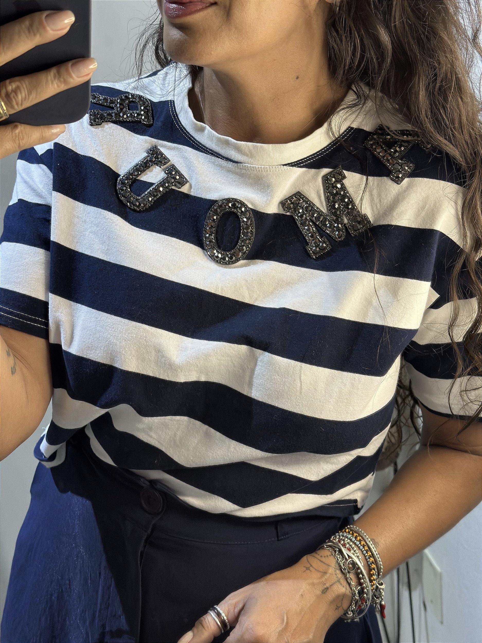 T shirt listrada,em algodão com elastano e detalhe na escrita amore.